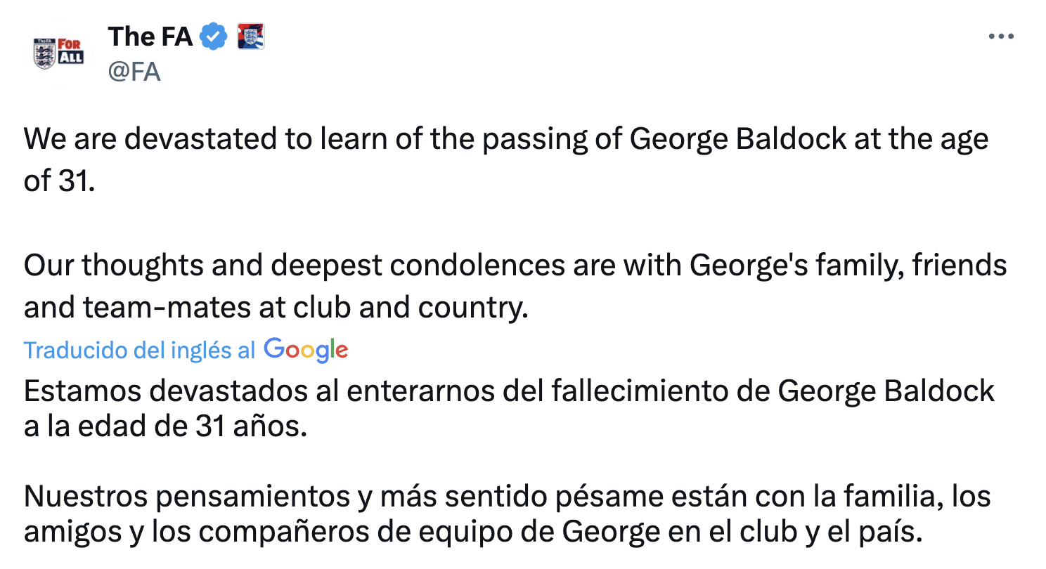 La FA inglesa, un país donde Baldock estuvo siete temporadas en el Sheffield United, confirmó que habría un minuto de silencio antes del partido de la Liga de Naciones de este jueves entre Inglaterra y Grecia en Wembley, y que los jugadores de ambos equipos llevarían brazaletes negros.