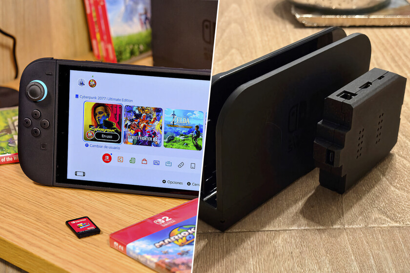 Con alguna complicación. El cambio de una estructura a otra no es difícil, aparentemente. Pero hay componentes como los cables flexibles ribbon que pueden sufrir en el intercambio, y la responsabilidad es del usuario. Una ves montado todo, el funcionamiento es sencillo. De la Switch 2 sale un cable USB-C extensor que va conectado a la base impresa. De ella, a su vez, sale un HDMI que va a la pantalla que queramos conectar, y a su lado hay otro puerto USB-C que alimenta la consola.